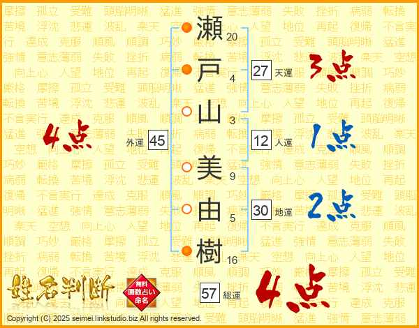 瀬(20画)戸(4画)山(3画) 美(9画)由(5画)樹(16画)