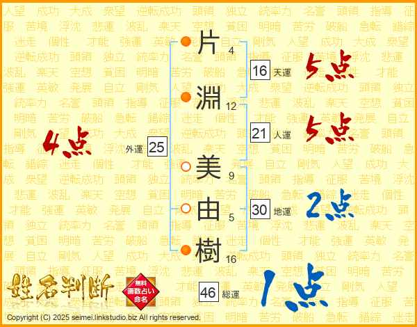 片(4画)淵(12画) 美(9画)由(5画)樹(16画)