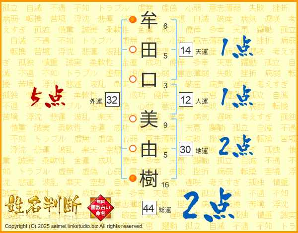 牟(6画)田(5画)口(3画) 美(9画)由(5画)樹(16画)