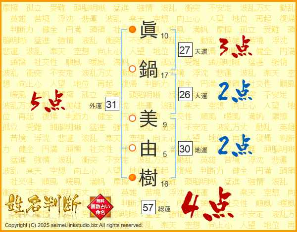 眞(10画)鍋(17画) 美(9画)由(5画)樹(16画)