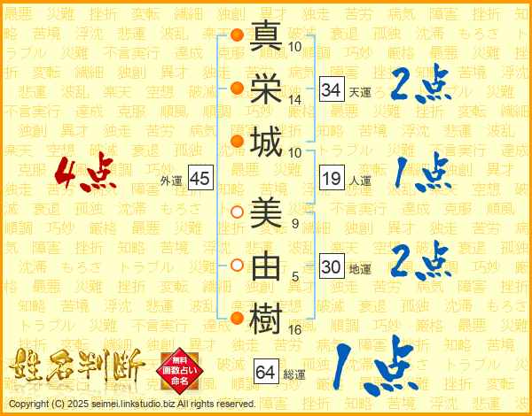 真(10画)栄(14画)城(10画) 美(9画)由(5画)樹(16画)