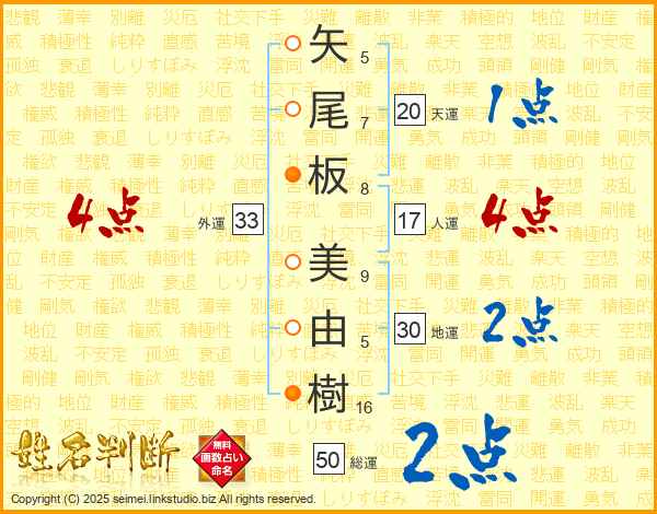 矢(5画)尾(7画)板(8画) 美(9画)由(5画)樹(16画)