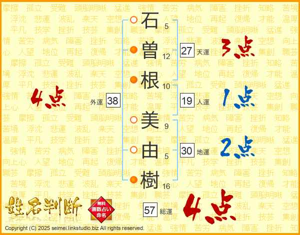 石(5画)曽(12画)根(10画) 美(9画)由(5画)樹(16画)