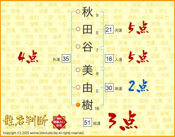 秋(9画)田(5画)谷(7画) 美(9画)由(5画)樹(16画)