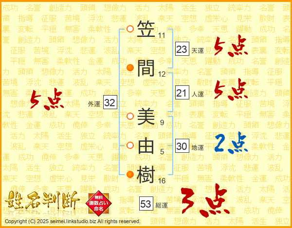 笠間美由樹さんの総運は53画の3点!