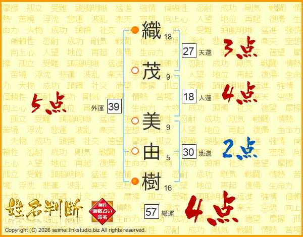 織(18画)茂(9画) 美(9画)由(5画)樹(16画)