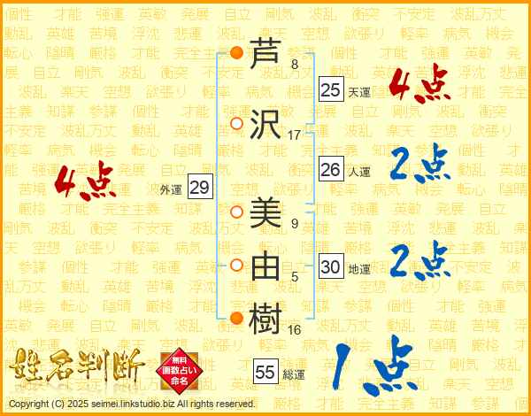 芦(8画)沢(17画) 美(9画)由(5画)樹(16画)