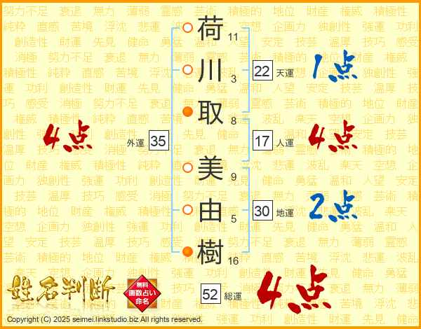 荷(11画)川(3画)取(8画) 美(9画)由(5画)樹(16画)