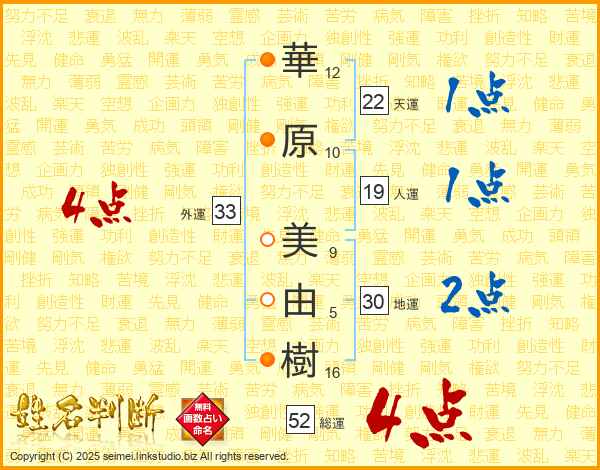 華(12画)原(10画) 美(9画)由(5画)樹(16画)