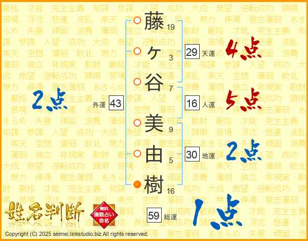 藤(19画)ヶ(3画)谷(7画) 美(9画)由(5画)樹(16画)