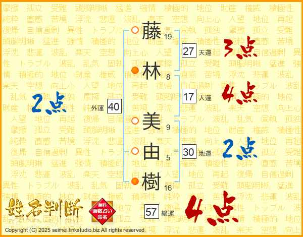 藤(19画)林(8画) 美(9画)由(5画)樹(16画)