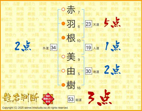 赤(7画)羽(6画)根(10画) 美(9画)由(5画)樹(16画)