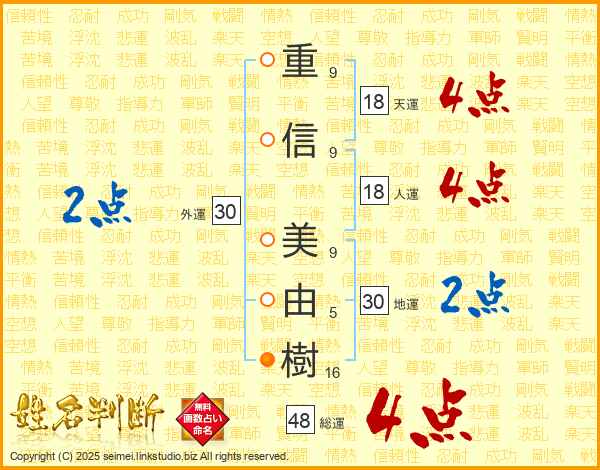 重(9画)信(9画) 美(9画)由(5画)樹(16画)