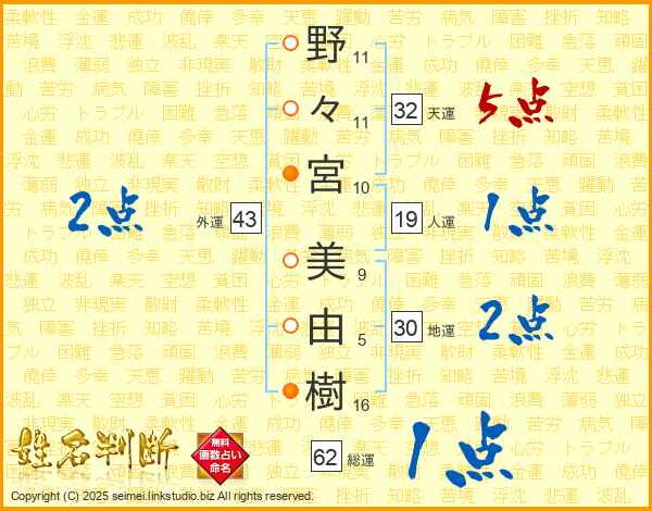 野(11画)々(11画)宮(10画) 美(9画)由(5画)樹(16画)