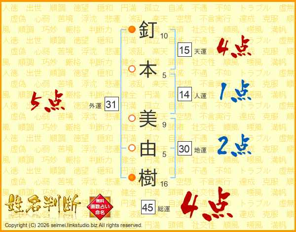 釘(10画)本(5画) 美(9画)由(5画)樹(16画)