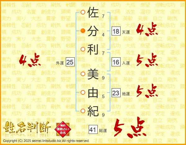 佐(7画)分(4画)利(7画) 美(9画)由(5画)紀(9画)