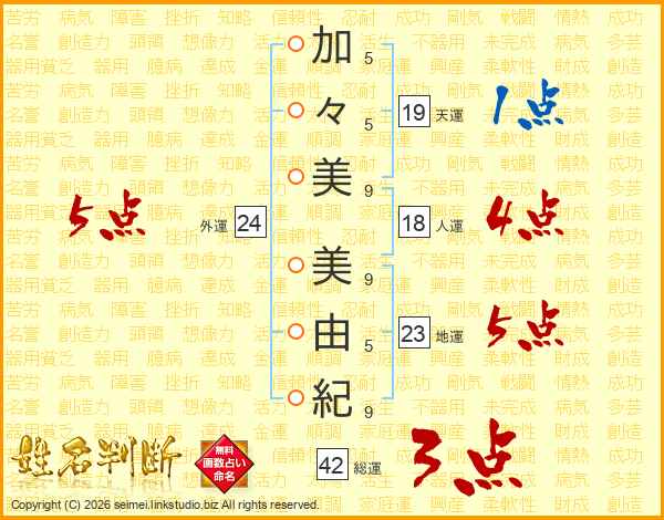 加(5画)々(5画)美(9画) 美(9画)由(5画)紀(9画)