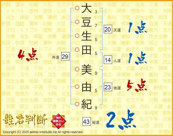 大(3画)豆(7画)生(5画)田(5画) 美(9画)由(5画)紀(9画)