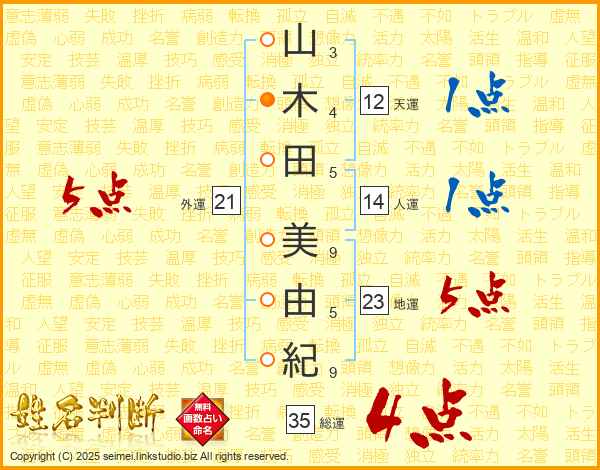 山(3画)木(4画)田(5画) 美(9画)由(5画)紀(9画)