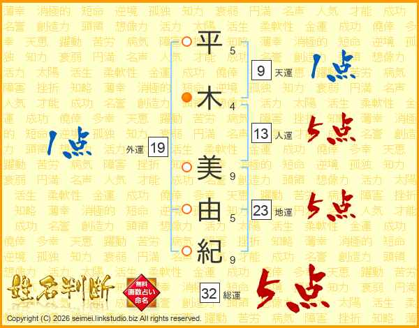 平(5画)木(4画) 美(9画)由(5画)紀(9画)
