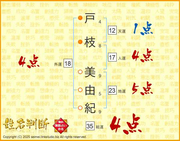戸(4画)枝(8画) 美(9画)由(5画)紀(9画)