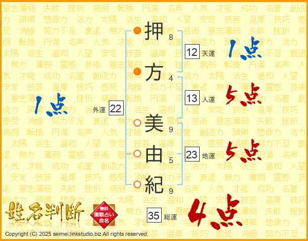 押(8画)方(4画) 美(9画)由(5画)紀(9画)