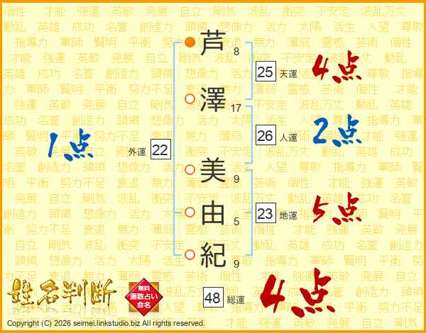 芦(8画)澤(17画) 美(9画)由(5画)紀(9画)
