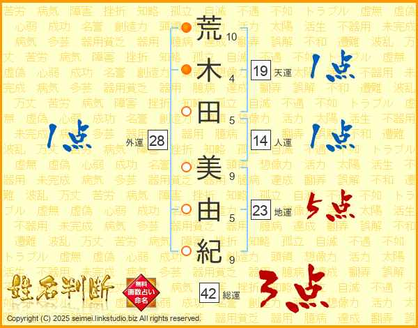 荒(10画)木(4画)田(5画) 美(9画)由(5画)紀(9画)