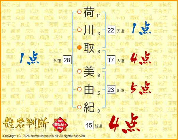 荷(11画)川(3画)取(8画) 美(9画)由(5画)紀(9画)