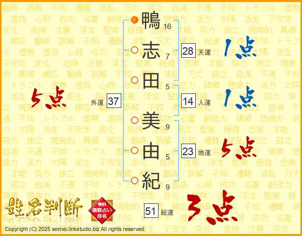 鴨(16画)志(7画)田(5画) 美(9画)由(5画)紀(9画)