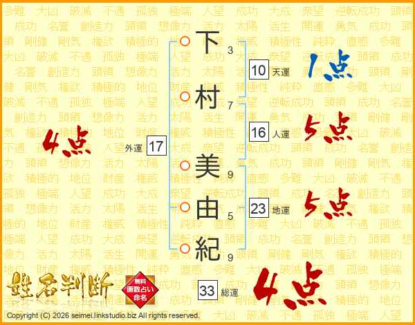 下村美由紀さんの総運は33画の4点!