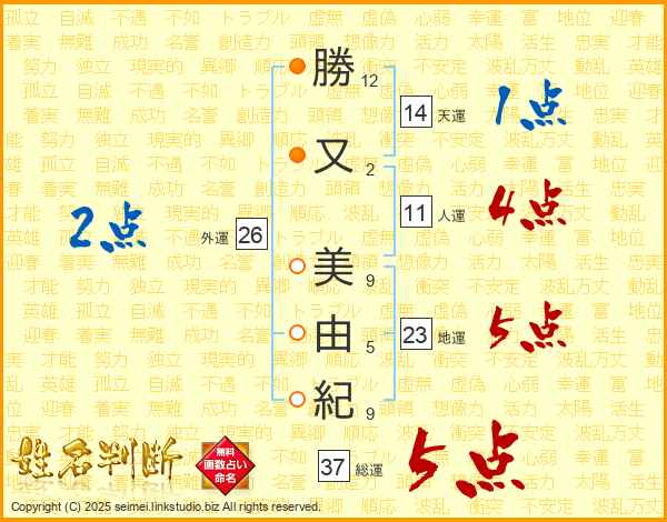 勝(12画)又(2画) 美(9画)由(5画)紀(9画)