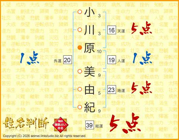 小(3画)川(3画)原(10画) 美(9画)由(5画)紀(9画)