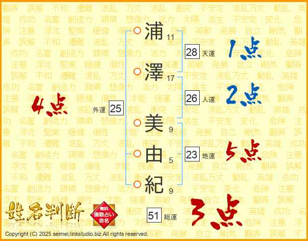 浦(11画)澤(17画) 美(9画)由(5画)紀(9画)