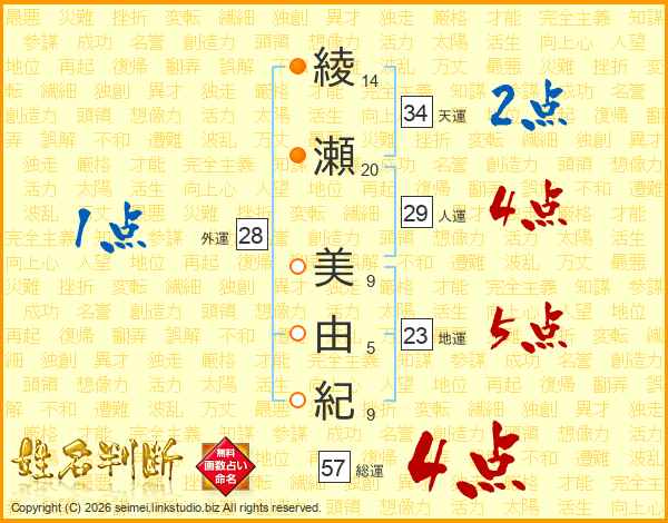 綾(14画)瀬(20画) 美(9画)由(5画)紀(9画)