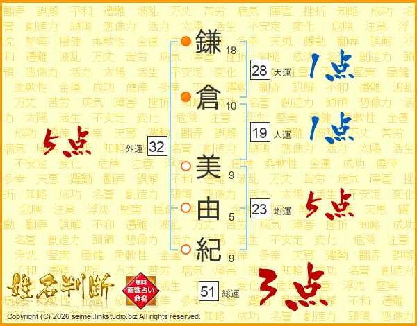 鎌(18画)倉(10画) 美(9画)由(5画)紀(9画)