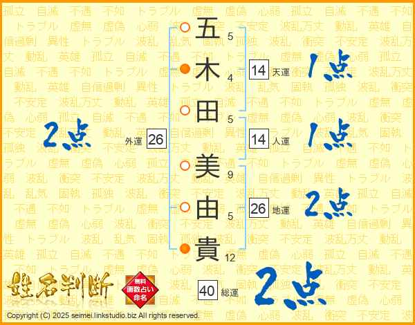 五(5画)木(4画)田(5画) 美(9画)由(5画)貴(12画)