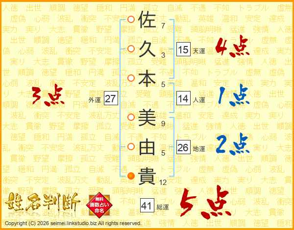 佐(7画)久(3画)本(5画) 美(9画)由(5画)貴(12画)