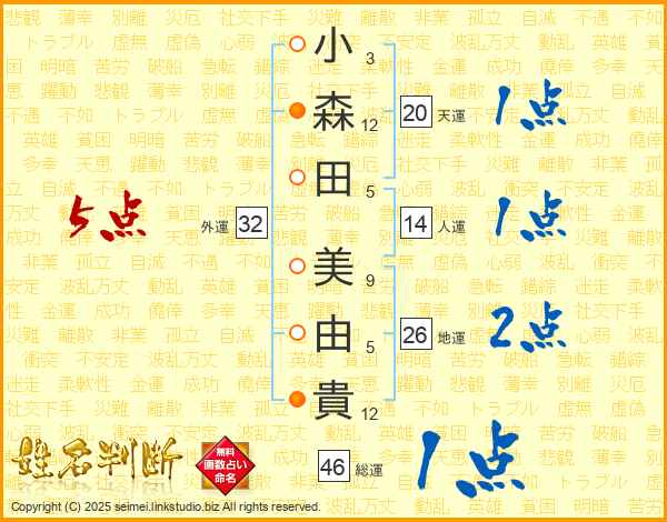 小(3画)森(12画)田(5画) 美(9画)由(5画)貴(12画)