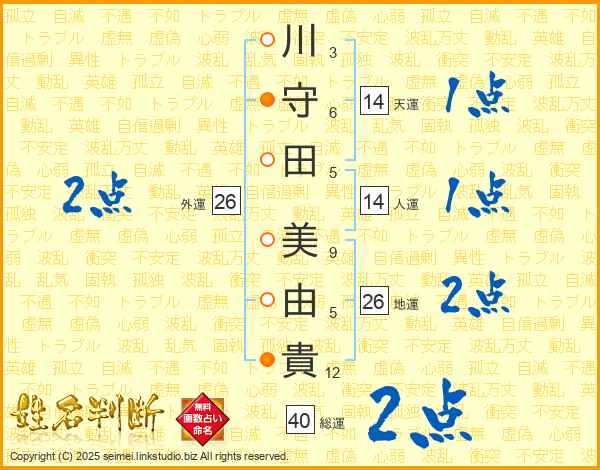 川(3画)守(6画)田(5画) 美(9画)由(5画)貴(12画)