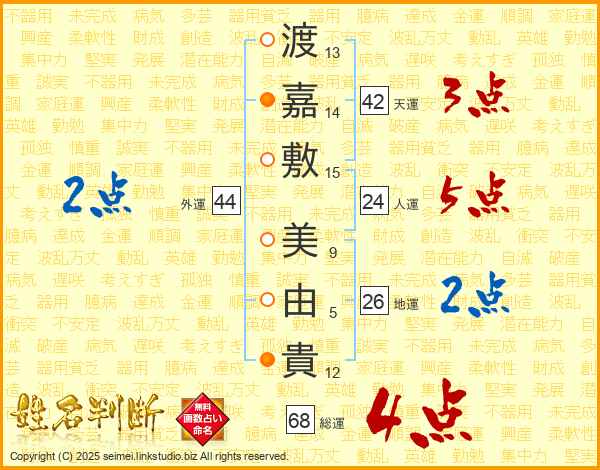 渡嘉敷美由貴さんの外運は44画の2点!