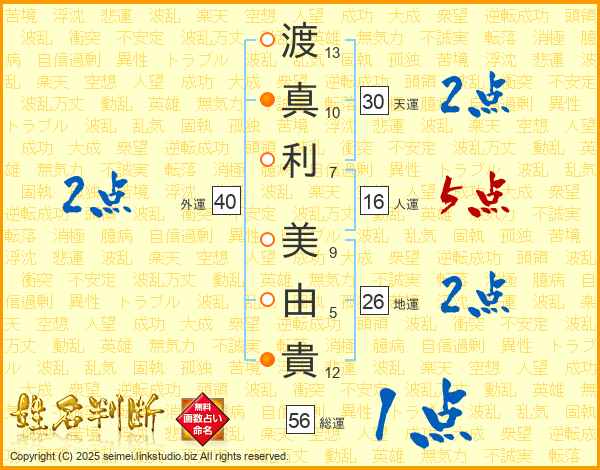 渡(13画)真(10画)利(7画) 美(9画)由(5画)貴(12画)