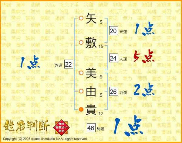 矢(5画)敷(15画) 美(9画)由(5画)貴(12画)