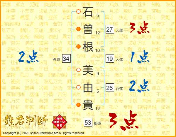 石(5画)曽(12画)根(10画) 美(9画)由(5画)貴(12画)