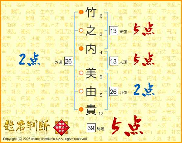 竹(6画)之(3画)内(4画) 美(9画)由(5画)貴(12画)