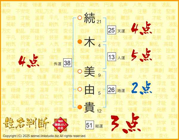 続(21画)木(4画) 美(9画)由(5画)貴(12画)