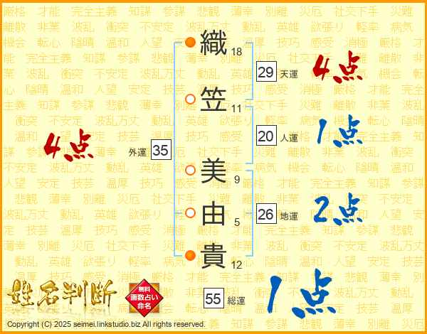 織(18画)笠(11画) 美(9画)由(5画)貴(12画)