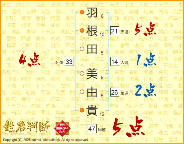 羽(6画)根(10画)田(5画) 美(9画)由(5画)貴(12画)