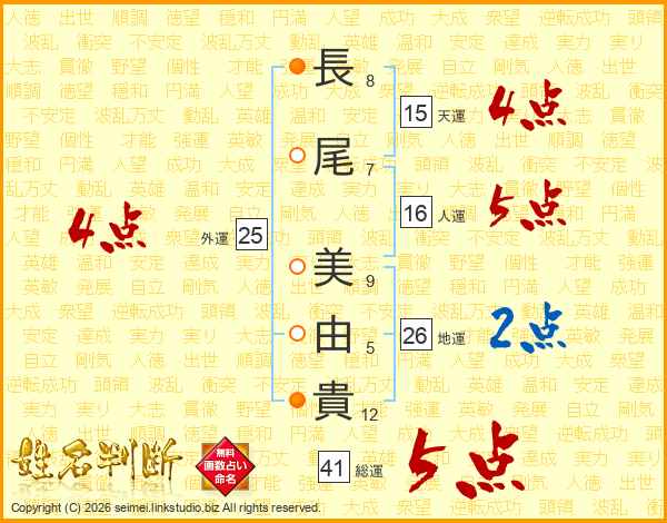 長(8画)尾(7画) 美(9画)由(5画)貴(12画)