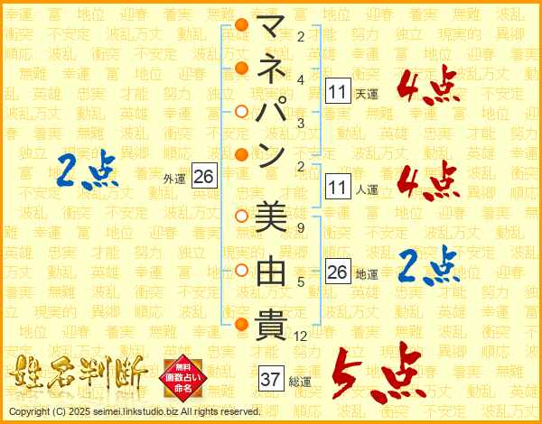 マ(2画)ネ(4画)パ(3画)ン(2画) 美(9画)由(5画)貴(12画)